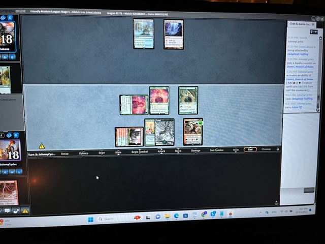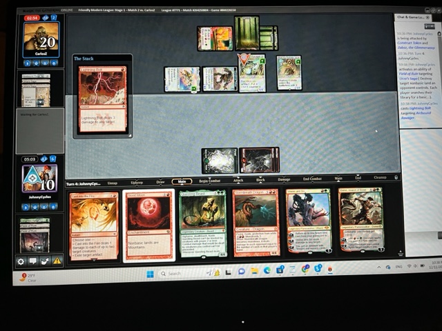 Game 3 – After glacially slow play from OP, I was half hoping to win via time out. OP must have been streaming or playing two matches, because they got it together, used a very fast, aggressive start, and punished my mana stumbles. Disappointing loss, as the match-up feels winnable.