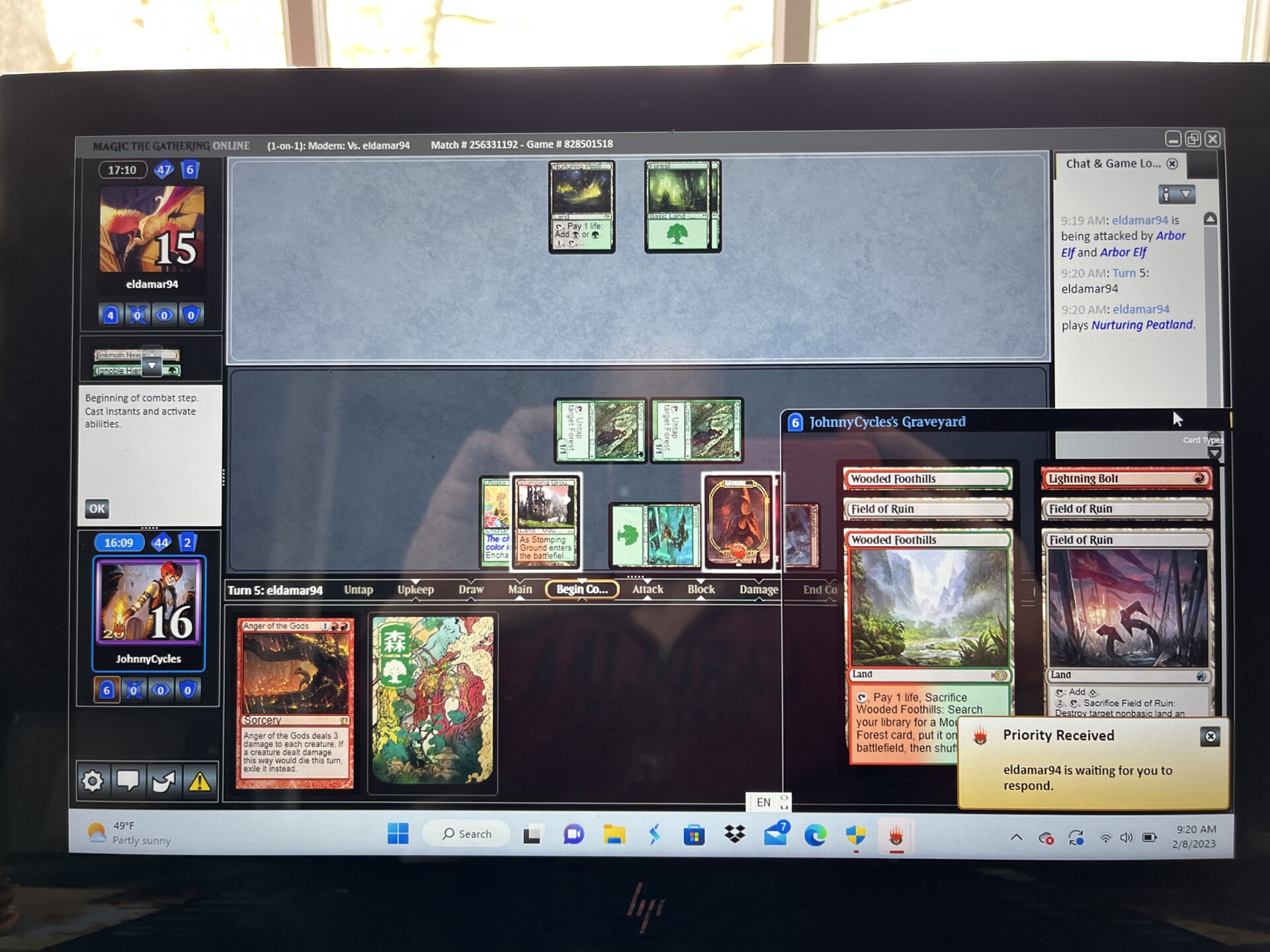 Lost this match 1-2 after drawing lands all of game 1. I died with 7 lands in my hand. That’s Magic, but the real irony of game 1 was that I used Field of Ruin every turn, thus thinning my deck to no basics and still drew only lands. Game 3 also saw major flooding, though I did draw a Igoble Hierarch late game. This is one drawback of playing a ramp deck. Sometimes you draw your ramp late when it is more or less useless. The odds of Game 1 happening again must be in the millions. Like lottery-winning odds. It was unbelievable.