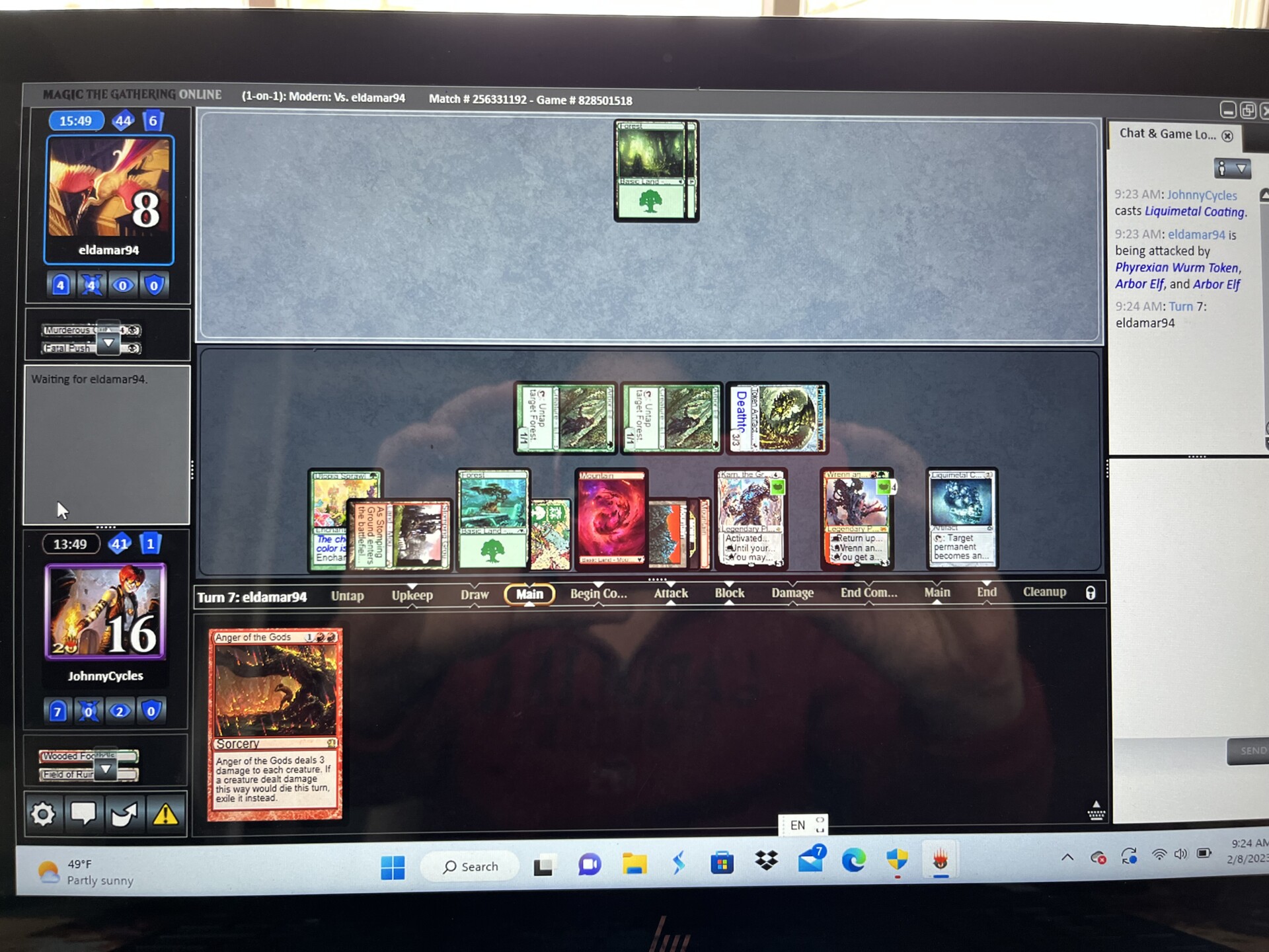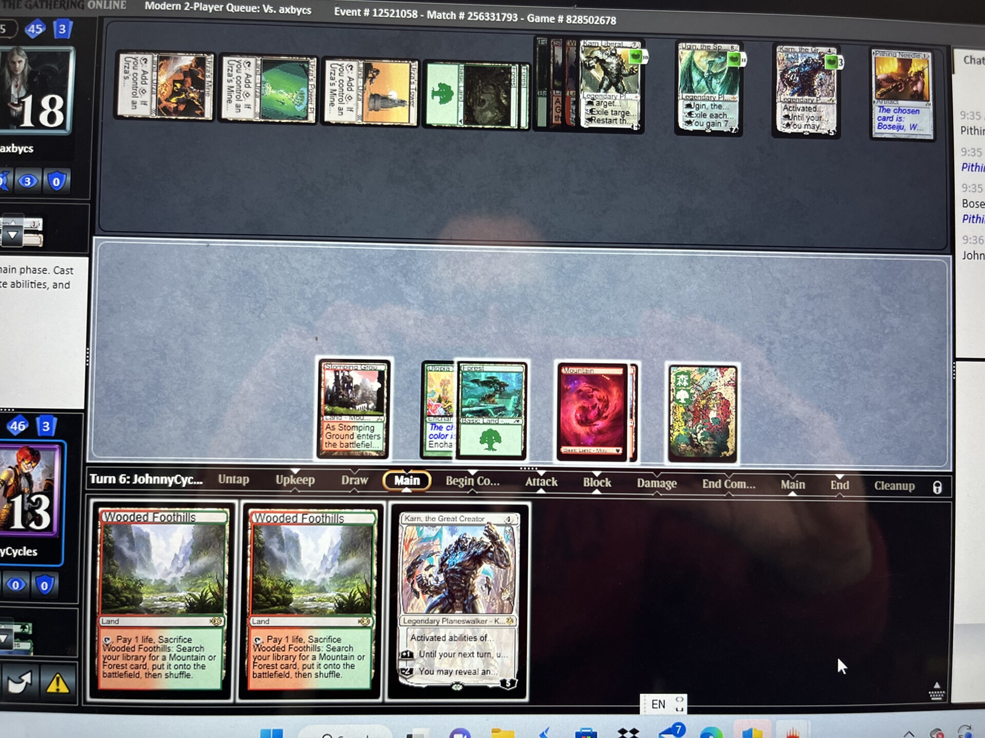 At this point, if these are the three Planeswalkers we’ve played, our opponent is probably very confused about what we’re trying to do. However, our deck also plays out in a more traditional tier-1 way. A turn 2 Wrenn and Six to ping a Ragavan, Nimble Pilferer is a familiar sequence for Modern players. Similarly, a Karn, the Great Creator fetching up a Liquimetal Coating will surprise no one.