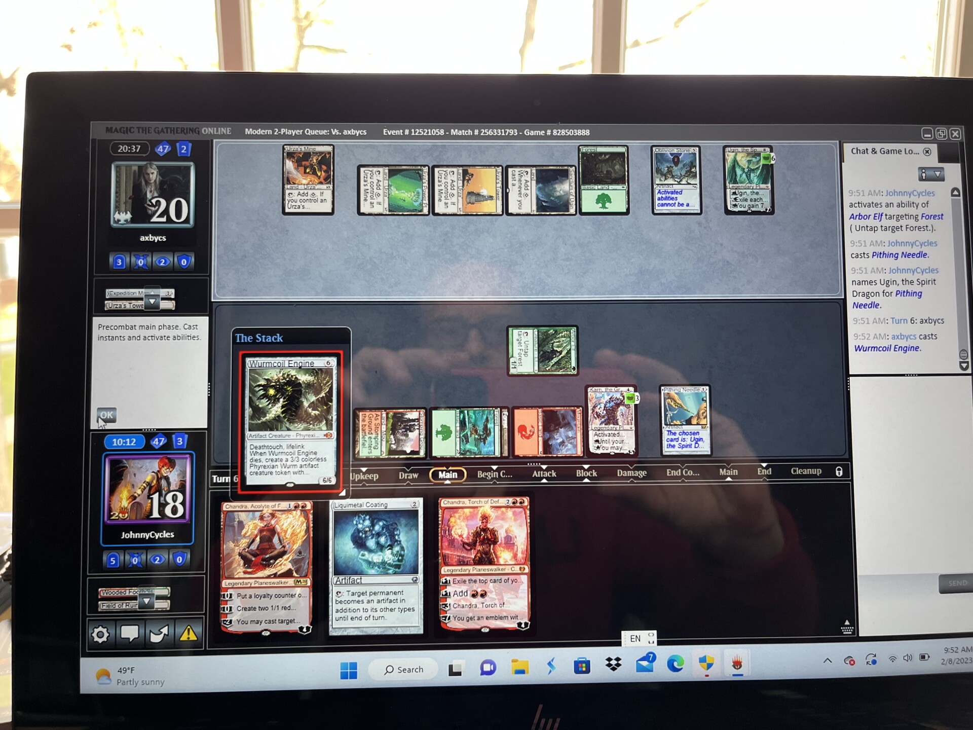 On to game 2! Heartless Summoning is a surprise…I knew they were up to no good, but I’m still unsure what that entails. A Wurmcoil Engine and a few turns later, my board state was the following: Wrenn and Six, Saheeli, Sublime Artificer, Chandra, Torch of Defiance, and Chandra, Acolyte of Flame, which I used to put loyalty counters on all my Walkers. This made Wrenn and big Chandra ready to ultimate on the next turn. I had 3 blockers from Saheeli to protect them…and my opponent scooped.