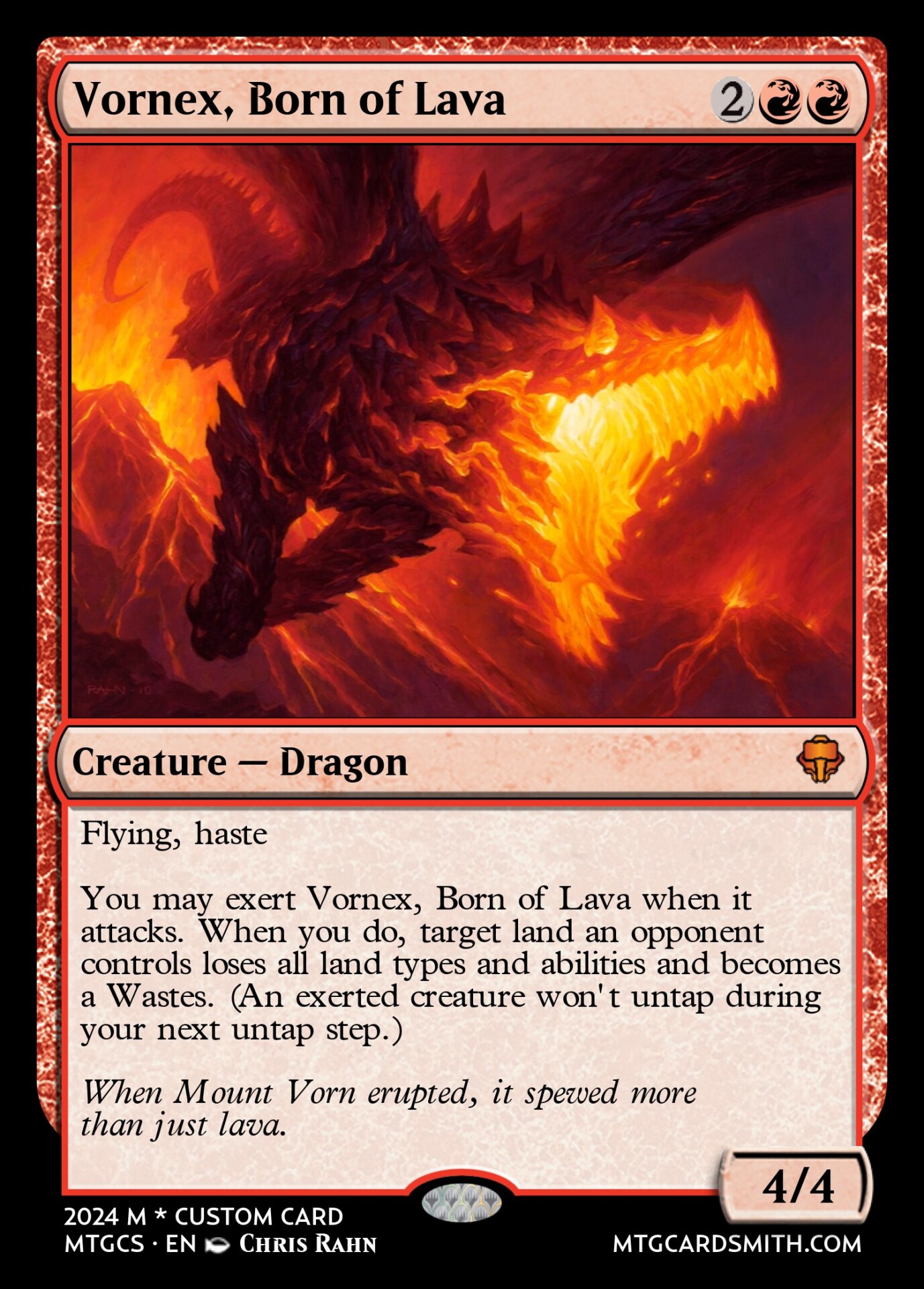 Writing this section made me notice the above similarities between Furnace Hellkite and the art I chose for my custom card, Vornex, Born of Lava. In case you didn’t recognize it when I first spoiled my third wish list card for MH3, I borrowed Chris Rain’s art from Volcanic Dragon.