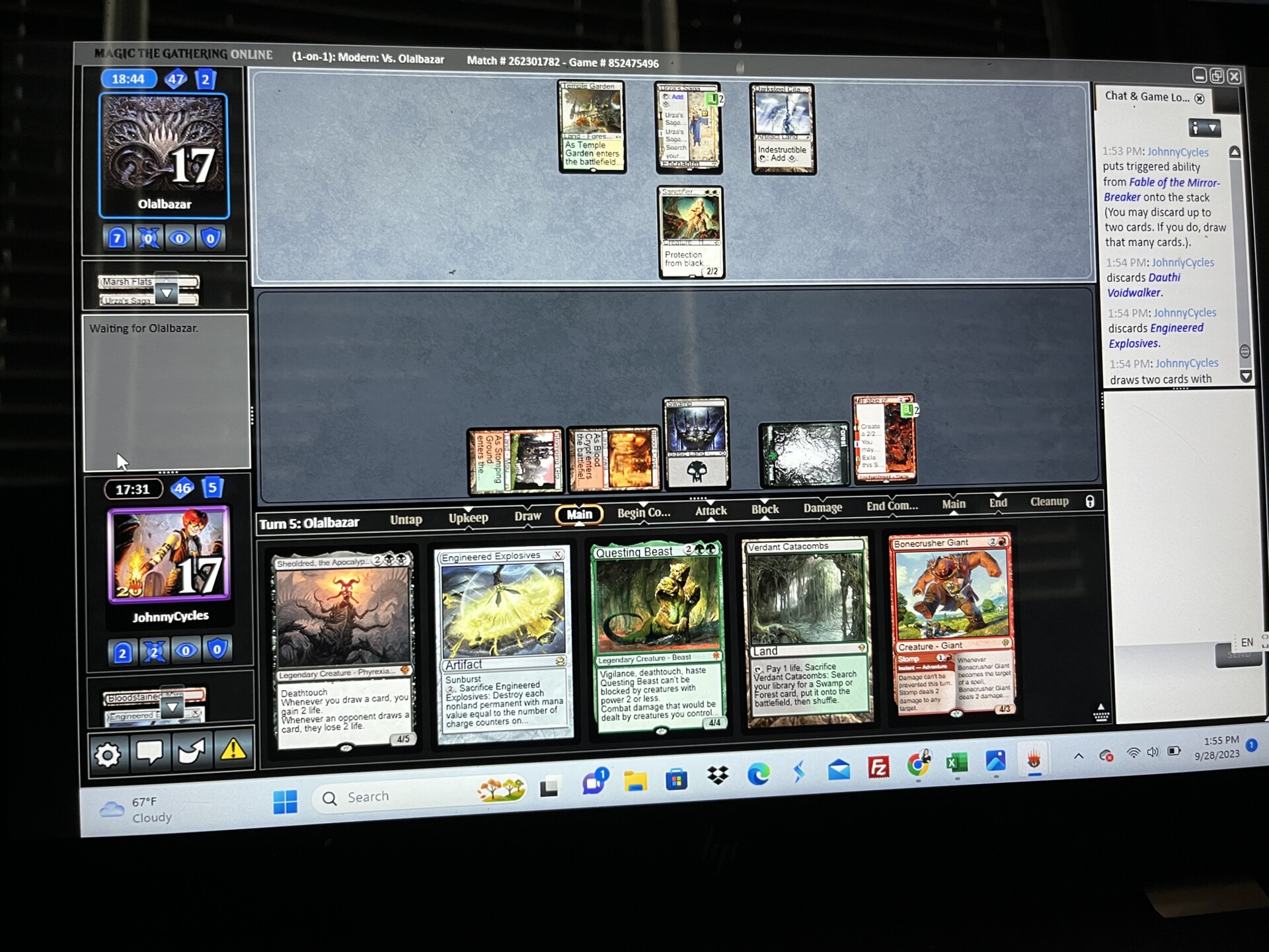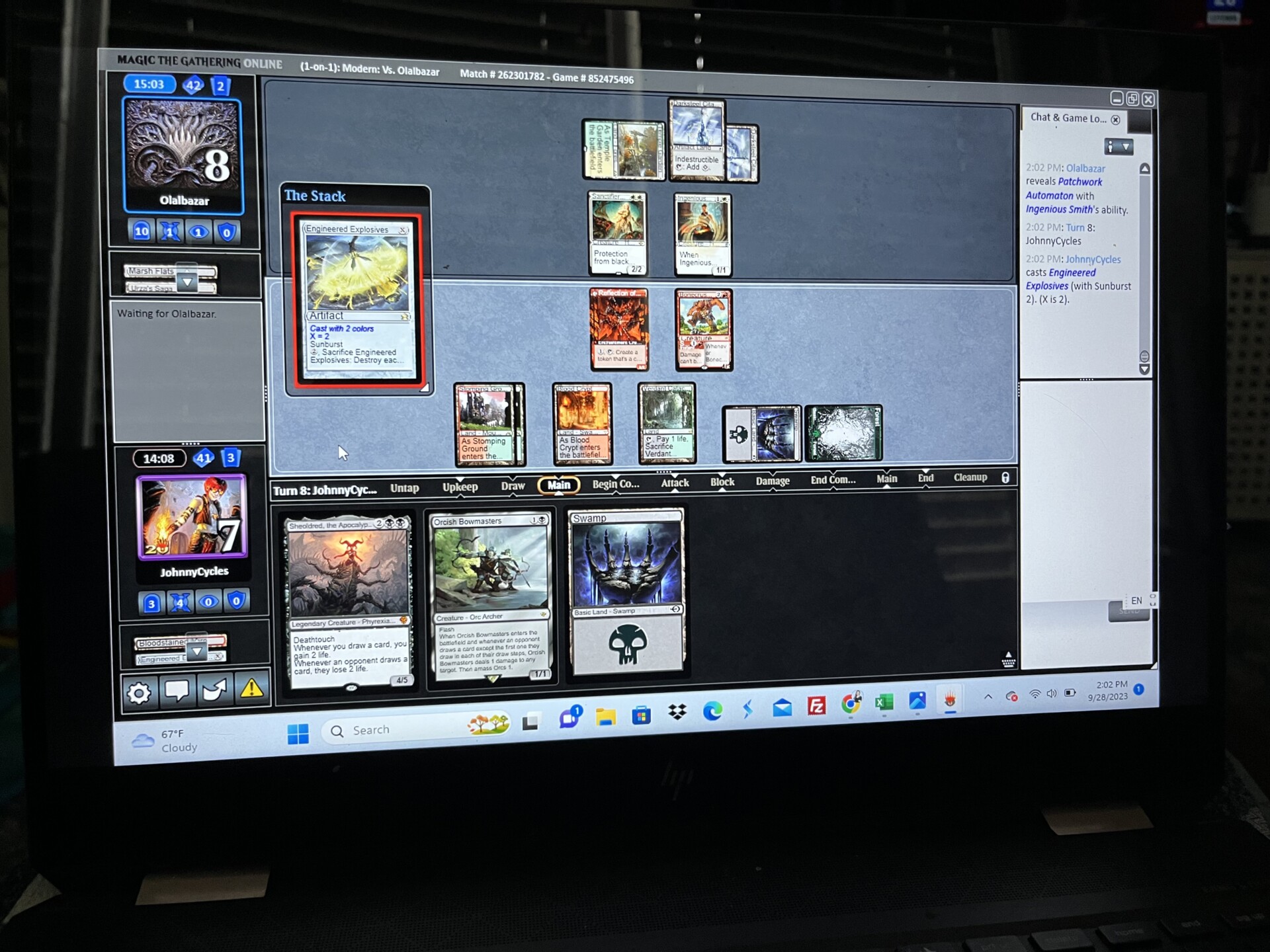 Sideboard Plan – Leylines out, as they do nothing against OP’s deck. Same with Endurance. Thoughtseize feels underpowered against a deck full of cheap threats that synergize with each other, but I could be wrong on that front. I brought in Engineered Explosives to fight against all the cheap creatures and Urza’s Saga tokens. Orcish Bowmasters and Bonecrusher Giant are just great cards that give me a clock. I thought about Assassin’s Trophy, but ultimately decided Stomp would be good enough. As you’ll see, Bonecrusher Giant closed out the game for me.