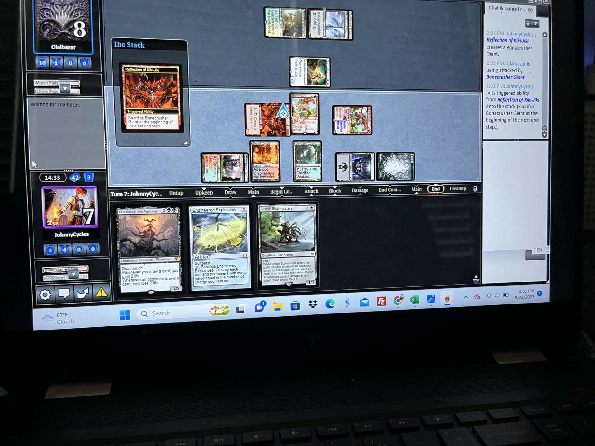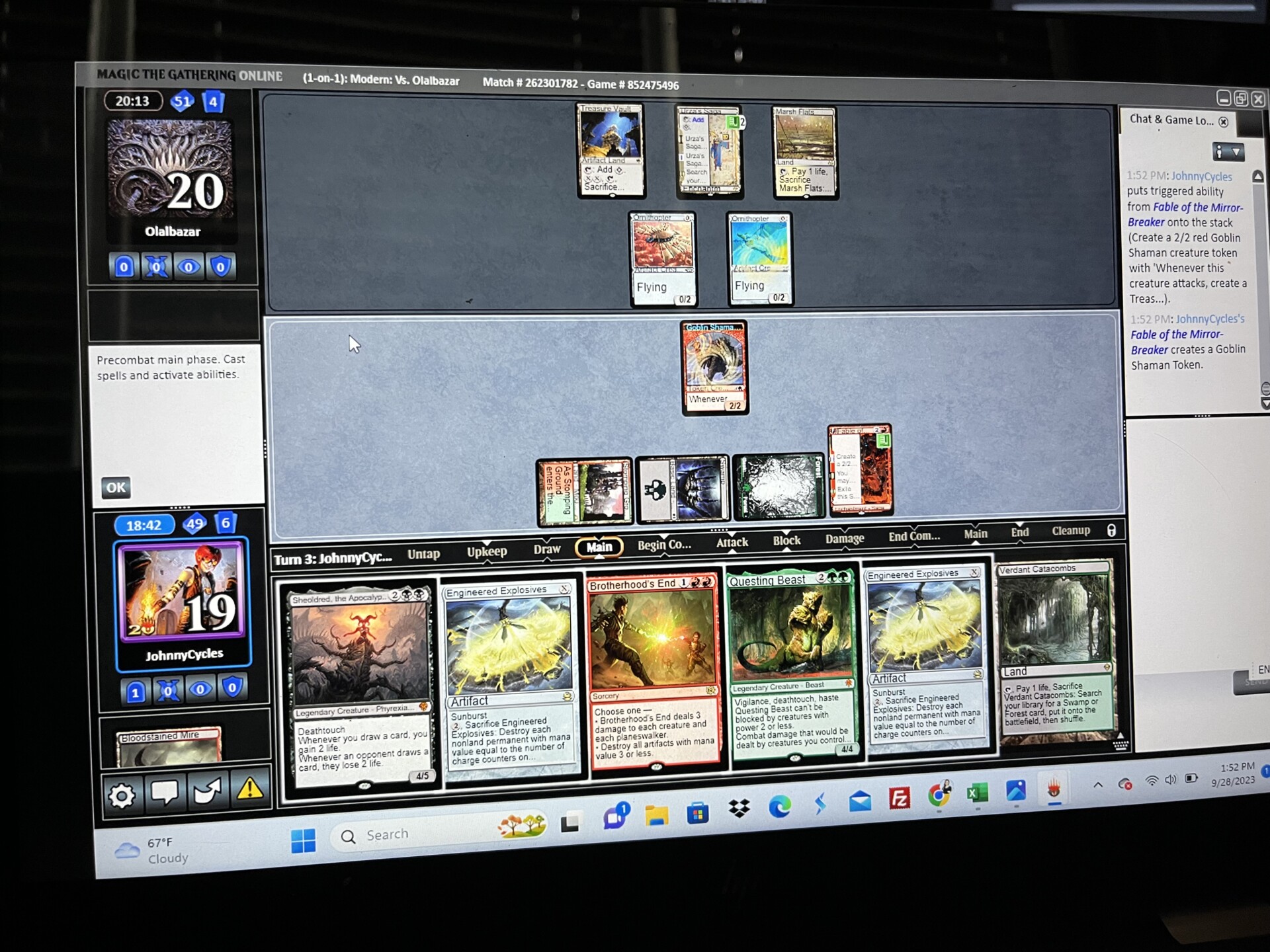 Game 2 – OP had a fast start and their own sideboard hate, but I drew extremely well…multiple sweepers, Fable of the Mirror-Breaker, and my own big threats were too much for OP. I’m sure they were a bit salty about the second Brotherhood’s End followed by the second Engineered Explosives (I discarded one to Fable).