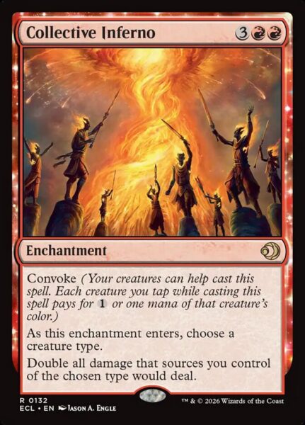 Collective Inferno is a busted card for any tribal deck in Red, but it will also do just fine in a deck with a few finishers that share a tribe. I know I can’t wait to find a spot for it in my Mono Red Dragon deck! Having convoke is what really makes this card so good, as we can get it down super early with the right draw.